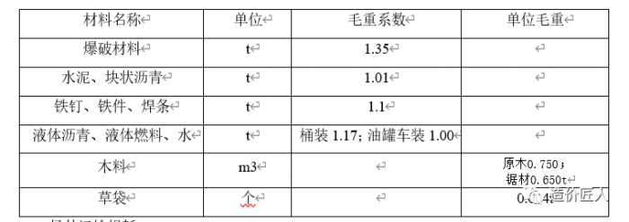 有容器或包裝的材料及長大輕浮材料,應(yīng)按規(guī)定的毛重計(jì)算。桶裝瀝青、汽油、柴油按每噸攤銷一個(gè)舊汽油桶計(jì)算包裝費(fèi)(不計(jì)回收)。